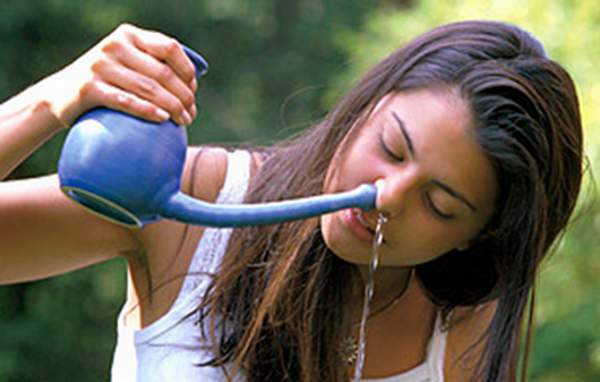 Napunite posudu i stanite iznad umivaonika. Desnom rukom približite posudu desnoj nosnici i nagnite glavu na suprotnu, lijevu stranu tako da možete polako krenuti s ulijevanjem vode u nosnicu. Voda će vam ulaziti kroz desnu nosnicu a izlaziti kroz lijevu. Pustite mlaz neka teče nekoliko sekundi. Uspravite se. Ispuhnite ostatak sadržaja nosa u maramicu i zatim krenite ulijevati vodu u suprotnu nosnicu. Postupak ponovite nekoliko puta a zatim, kada istekne iz posude sva voda i kada očistite obje nosnice, ispušite nos. Ispuhivanje nosa na kraju postupka je također važan dio procesa detaljnog čišćenja. Na taj način osušimo i do kraja očistimo prostor nosne šupljine od tekućine u kojoj bi se, pomiješano sa sluzi, s vremenom mogli razviti mikroorganizmi. Tijekom postupka čišćenja, dišete na usta.